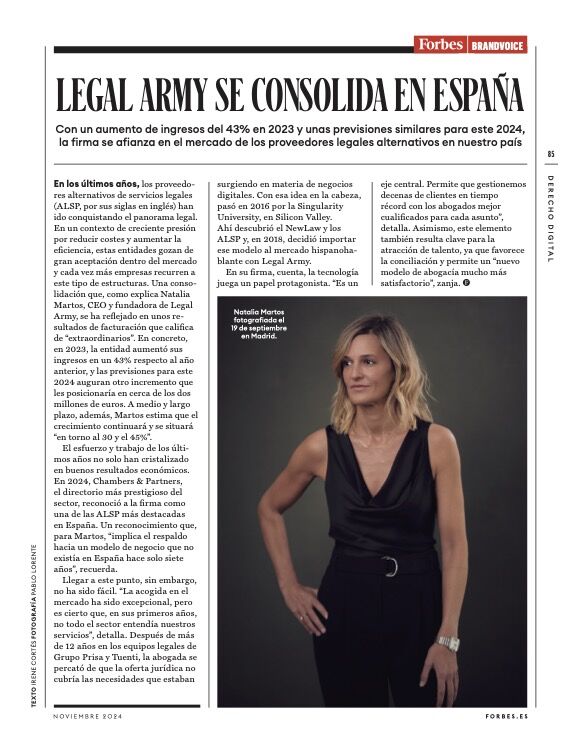 Desde 2021 su firma, Legal Army, ha sido incluida en #Chambers&Partners como uno de los mejores ALSP de España, llegando a la ansiada Banda 1 en el año 2023, 2024 y 2025. Asimismo, Natalia ha sido clasificada en este mismo directorio en la Banda 1 como “individual” en ALSP en 2025.